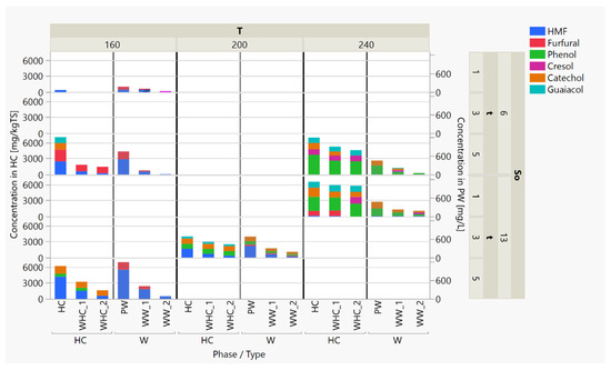 Comparison of the individual aromatic compounds measured in the hydrochar (HC) and process water (PW) under the different process conditions: T, t, So.