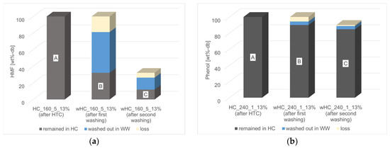 The comparison of the % mass of HMF and phenol in hydrochar after production to that recovered after two washings in the wash waters and in the hydrochar can be seen in Figure 11 for the runs D_160_5_13% (Figure 11a) and D_240_1_13% (Figure 11b). The calculations are based on the mass balance considering the hydrochars and wash waters, and the difference between the input and output is shown as loss. There is a dramatically decreasing trend in HMF mass in hydrochars after each washing, with approximately 88% of HMF mass washed out from the original hydrochar. In contrast, the % mass of phenol in hydrochar decreased only slightly after each washing, with the result that only 15% of the phenol mass was removed from the original hydrochar. These differences between the % mass of HMF/phenol in HC and wHC are significant based on the Tukey–Kramer test (different uppercase letters (A, B, C) indicate significance at p < 0.001 levels).