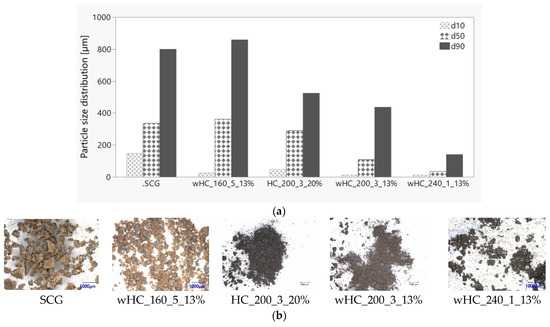 The agglomeration of the fine hydrochar particles into larger-size pellets is an important step in order to improve the handling and transportation of the hydrochars as fuel or as soil amendments. Since the particle size of the starting materials is a critical factor in an effective agglomeration process [69], the particle size distributions of the feedstock SCGs and washed and unwashed hydrochars were analyzed (Table 5). Although SCGs are finely ground, only 10% of the particles in this study have diameters less than 150 µm (d10), with 80% falling within the range 150–800 µm (d10–d90). After HTC conversion and filtration from the HTC slurry, the particles became even smaller, with d10 decreasing to <50 µm. Similar results for hydrochar from SCGs were found by [16,40]. As HTC temperatures increased, there was a significant reduction in hydrochar particle sizes, most likely due to devolatilization and depolymerization reactions [27]. The size for 90% of the particles of hydrochar particles (d90) was reduced by approximately 84%, from 885 µm (at 160 °C) to 141 µm (at 240 °C) (Figure 12a,b). Although Park et al. (2021) [16] also found that the larger particles (>500 µm) disappeared as the HTC temperature was raised from 170–250 °C, the major gain was in particle sizes between 100–500 µm, with only small increases seen below 100 µm. The subsequent washing step reduced the particle size even more, as can be seen for washed hydrochar (wHC_200_3_13%) compared to unwashed hydrochar (HC_200_3_20%) at similar process conditions (Figure 12a).