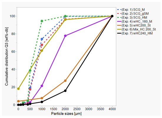 Cumulative distribution (Q3) of the particle sizes of agglomerated spherical pellets produced from SCGs (Exp. 1, 2, 3; visualized by dashed lines), from wHC (Exp. 4, 5, 7), and from a mixture of wHC and HC (Exp. 6) (visualized by solid lines) with plant-based additives (hemp leaves (H), ground corn straw (gS), corn starch (S), and a binder solution of methylcellulose acetate (M)).