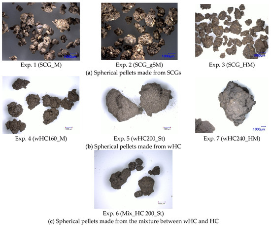 After determining the particle size of the starting materials, seven agglomeration experiments to produce spherical pellets were carried out using SCGs, three washed (wHC) and one unwashed hydrochar (HC) with three plant-based additives, and a binder solution of methylcellulose acetate (see Table 4 for compositions). The differences in the sizes of the spherical pellets obtained for each of the starting materials are visualized in Figure 13, which illustrates the cumulative distribution Q3 of successfully formed spherical pellets from both SCGs and their hydrochars (measured values are provided in Table S9 in SM). In general, the particle size distribution of the starting products has a decisive influence on the pelleting behavior. It is also important that there is a particle size distribution (no monoparticles). The results here show that the coarser the starting material, the smaller the size of the pellets produced, irrespective of the additive used. Over 70% of the spherical pellets produced from SCG are 1000 µm or smaller in size (Exp. 1–3) (Figure 13, dashed lines). A similar pattern was observed with hydrochar in Exp. 4 (wHC160_M) and Exp. 6 (Mix_HC 200_St) (Figure 13, solid lines). In both of these experiments, a significant number of spherical pellets measuring 1000 µm or less in size were obtained, comparable to what was observed using SCGs. This behavior can be attributed to the coarser particles present in the starting materials. In contrast, the agglomeration tests with the starting materials with finer particles (washed hydrochar made at the higher temperatures 200 °C and 240 °C with d10 < 15 µm) resulted in the production of larger pellets, e.g., in Exp. 7, wHC240_HM, 85% of the pellets fell between 2000–4000 µm (Figure 13, black solid line). The washing of the hydrochar may also play a role here, increasing the wettability of the particle surface with the binding agent (M). Only when a degree of saturation of approx. 80% is reached do the binding adhesion forces/capillary forces act against the separating shear forces in the mixer. The high speeds of the agitator (1800 rpm) promote the particle–particle collision and thus the effectiveness of the binding forces. The duration of the pelletizing process is also decisive for the agglomerate size. Here, a longer dwell time is positive for the formation of larger pellets. However, the following effect also occurs: the simultaneous compaction of the pellet structures can cause pelletizing liquid to escape onto the particle surface, which then leads to the optimum degree of saturation being exceeded (“wet” surface) and promotes the formation of secondary pellets (i.e., pellets from pellets). Therefore, a material-specific optimum is necessary. Figure 14 shows microscopic images of agglomerated spherical pellets, highlighting variations in size and shape among spherical pellets from SCG, wHC, and a wHC and HC mixture.