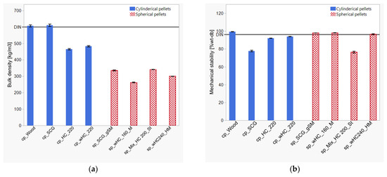 Physical tests for spherical pellets (sp) and cylindrical pellets (cp) and a comparison with the standard (DIN EN ISO 17225-8:2023): (a) bulk density and (b) mechanical stability (standard deviation from n = 4).