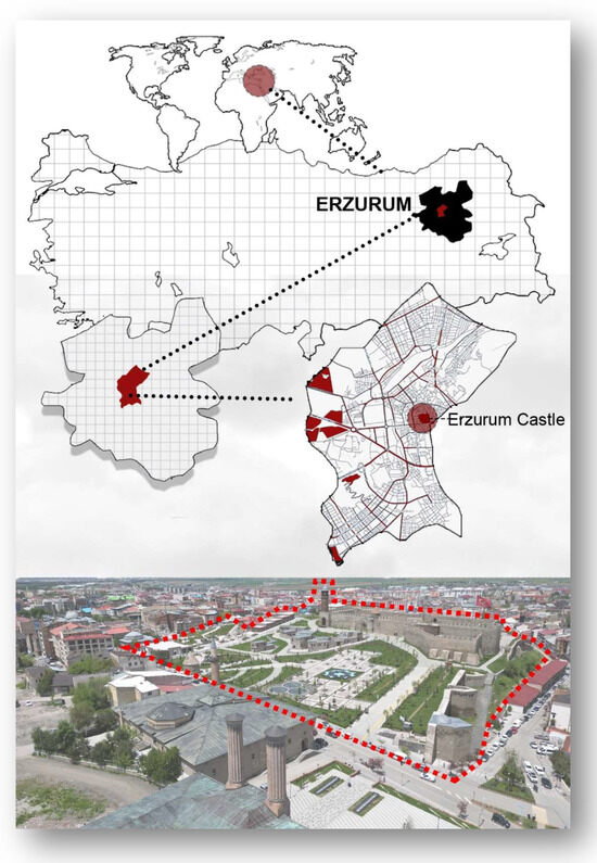 It is seen that in most of the studies focusing on students in the field of awareness and perception of cultural heritage, students from the field of tourism (tourism guidance, tourism management and hotel management, and tourism and hotel management) are determined as the sample. Among these, ref. [61] reveals students’ perceptions of the concept of cultural heritage, ref. [62] measures students’ perceptions of tangible cultural assets, and [63] determines students’ attitudes towards cultural heritage. However, while there are no studies directly related to awareness and perception of architectural heritage in the national architectural literature, ref. [64] emphasized that the main actor in cultural heritage conservation is the individual and the importance of individual awareness, consciousness, and education. It also examined virtual reality applications as an awareness-raising tool [65]. In short, the literature review shows that at national and international scales, the topic is popular in the field of tourism, which considers cultural heritage as a tourist product that increases the attractiveness of tourism centers rather than in the fields of expertise that design the built environment where architectural heritage is located and/or are involved in the conservation processes of existing architectural heritage. In addition, in none of the studies focusing on the perception and awareness of architectural heritage, the expert group (architects, landscape architects, city and regional planners, local administrators, engineers, etc.), which can be considered to have different levels of knowledge about architecture and architectural heritage, and different sample groups such as city residents, visitors to the city, and students, which constitute the local public group, have not been put forward within the framework of conservation sensitivity, visuality, and sustainability perception. In addition, there are not many studies in the literature to determine the effects of landscape and restoration works centered on Erzurum Castle on the perception and awareness of cultural heritage and architectural heritage. For these reasons, this study, which aims to contribute to filling the gap in the literature, is thought to be very important in terms of explaining issues such as the importance of the public’s perception of cultural assets, which emphasizes human and human values, especially since the 1970s, from the international regulations that guide conservation policies and practices in the following chapters, as well as the necessity of raising public awareness, education, and awareness in order to ensure conservation.