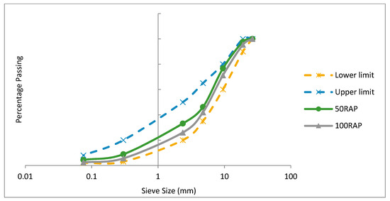 The binder content of RAP was extracted to be 5% by aggregate weight using the centrifuge rotavapor extraction method [32]. The physical properties of the extracted RAP binder and bitumen emulsion (CSS2) are shown in Table 2. After going through various works of literature, the RAP material was selected in amounts of 0%, 50%, and 100% of the total dry aggregate weight. The aggregate gradation of the CMA with 50% and 100% RAP was within limits as per MORT&H specifications (Figure 1), and their physical appearance is shown in Figure 2.