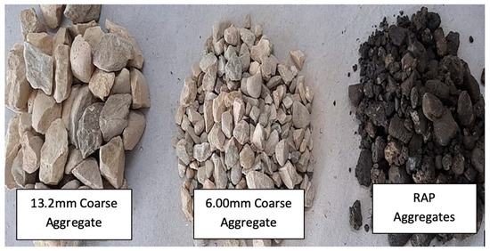 Physical appearance of aggregates used in CMA design: 13.2 mm coarse aggregates, 6 mm aggregates, and RAP (from left to right).