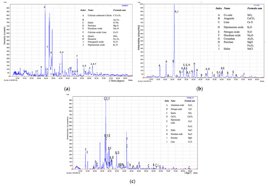 From the ordinary Portland cement XRD analysis (presented in Figure 3a), it was seen that cement consists of calcite (CaCO3), alumina (Al2O3), halite (NaCl), and periclase (MgO). These compounds make up around 75% of cement and react with moisture in CMA mixtures. This influence the strength of mixtures. CaCO3 reacts with water present in the CMA mix, resulting in the formation of calcium hydroxide and heat. These reactions are presented in Equation (5).