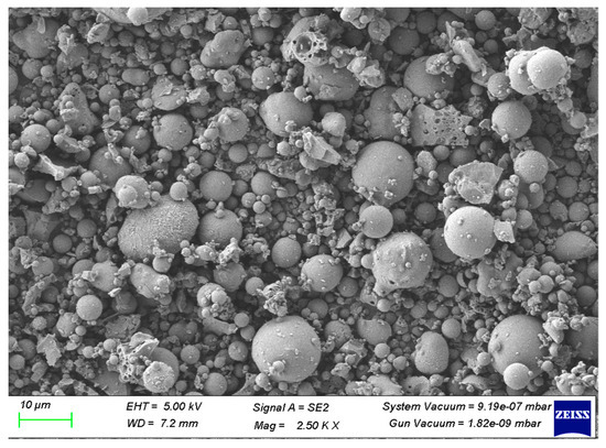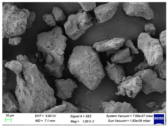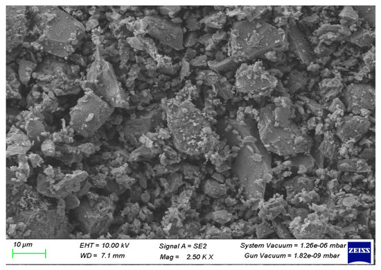 The chemical compositions of the filler additive used in the recycled cold mix studied were identified by X-ray Diffraction (XRD) analysis, as presented in Table 3. Figure 3a–c represent the XRD analysis of the filler additives. XRD analysis is a high-tech, non-destructive technique for analyzing materials and their characterization. The microscopic images of filler additives shown in Figure 4, Figure 5 and Figure 6 were obtained using scanning electron microscope (SEM) imaging using a Carl Zeiss Gemini FE-SEM so that the shape and texture of the fillers can be seen.
