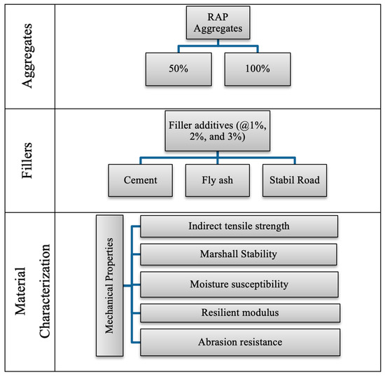 While studying cold recycled asphalt mixtures (CRAMs) in the laboratory, materials like coarse and fine virgin aggregates (VA), recycled asphalt pavement, and various filler additives were used in the sample preparation. The virgin materials were collected from a local quarry in Roorkee, Uttarakhand, India. VA and RAP’s mechanical and physical properties were evaluated per the requirement specified in the Indian Scenario (presented in Table 1) [26,27]. The recycled material was collected near the National Highway in the Uttar Pradesh state of India and was almost eight years old. The collected RAP materials were crushed into smaller sizes in a thermostatically controlled oven for 48 h by maintaining 100 °C temperature. Based on the literature, the RAP dosages were selected as 0%, 50%, and 100% in place of virgin aggregates when constructing CRAMs [24,28,29,30,31].