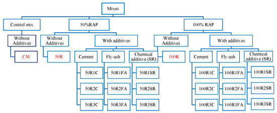 In this research, 21 types of cold mixes are designed, as indicated in Figure 8: one control mix and 20 mixes with varying additives and RAP. The control mix was prepared without additives and termed CM, and the rest of the mixtures were designed with 50% and 100% RAP, termed 50R and 100R, respectively, using additives from 1% to 3% with a 1% increment—a mixture with 50% RAP and 1% ordinary Portland cement as the additive was 50R1C. Likewise, 50R2C and 50R3C indicate a recycled cold mix (RCM) with 2% and 3% ordinary Portland cement as additives. A recycled cold mix of 50R with 1%, 2%, and 3% FA and 1%, 2%, and 3% SR additives were termed 50R1FA, 50R2FA, 50R3FA, 50R1SR, 50R2SR, and 50R3SR, respectively. Likewise, a 100R RCM with cement, FA, and SR additives in 1%, 2%, and 3% increments were termed 100R1C, 100R2C, 100R3C, 100R1FA, 100R2FA, 100R3FA, 100R1SR, 100R2SR, and 100R3SR, respectively.