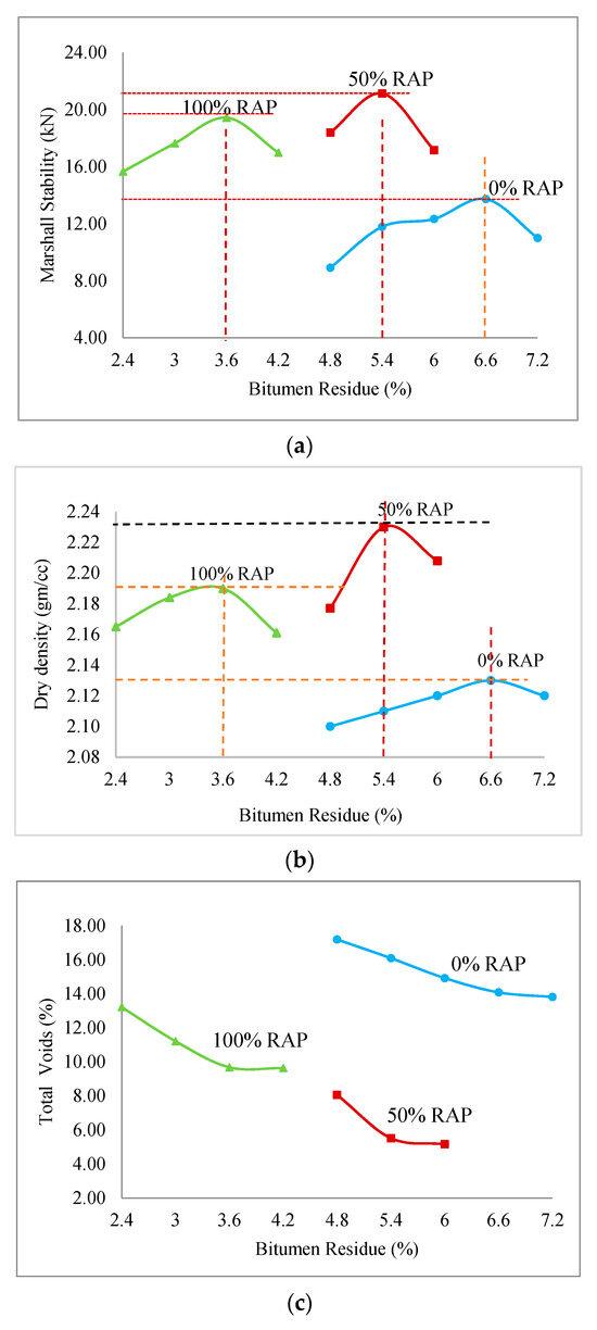 All CMA samples (with and without RAP) were compacted in a Superpave gyratory compactor (SGC) with 80–110 gyrations. The volumetric properties (MS, dry density, total voids, and voids in mineral aggregates) of the CMA mixtures with 0% RAP, 50% RAP, and 100% RAP aggregates were determined per the Asphalt Institute MS-14. The relationship between MS, dry density, air voids, and voids in mineral aggregate (VMA) vs. bitumen residue is presented in Figure 9a–d. From Figure 9a,b, the maximum MS and maximum dry density were obtained at 6.60%, 5.40%, and 3.60% bitumen residue of the dry aggregate weight for the CM, 50R, and 100R mix, respectively. The minimum bitumen residue was required for the 100R mix only due to the presence of bitumen on RAP aggregates.