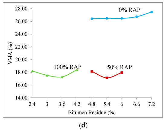 The VMA value for mixes determines the durability performance of the cold mixtures, and the VMA results for all the cold mixes are shown in Figure 9d. For CMA design, the minimum VMA was taken as 14% per MORT&H specifications [51] for a 19 mm nominal maximum aggregate size. The VMA of the mix with and without RAP content was evaluated to be 26.75%, 17.14%, and 17.29% for the 0%, 50%, and 100% RAP mixes, respectively, without additives.