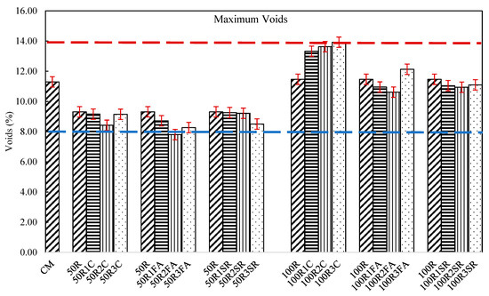 All CMA mixtures with and without RAP were found to contain between 7 and14% voids, as graphically presented in Figure 10. The voids shown in CMA mixtures are higher than HMA (3–5%, as per MORT&H specifications) due to water in the binder (CSS2) used in the CMA mix design. Air voids decrease with increasing additive quantity (1 to 3%) in the 50% RAP mixtures, but voids increase with 100% RAP mixtures compared to CM and 50R due to the absence of fine particles in the 100R mix. The number of voids of the 100R mixtures increased with cement additives and were attributed to cement hydration with RAP. During the hydration process of CMA mixtures, water is absorbed by cement molecules, increasing the volume, so the number of voids increase in the mix. Also, some micro-voids were presented in the mix, so the emulsion did not penetrate these voids [53]. The number of voids in the mixes was reduced due to 50% RAP and increased due to 100% RAP compared to the control mix. With the addition of cement and FA as additives with the 50% RAP mixtures, the number of voids reduced by up to 2%, but at a 3% addition, the number of voids in the mixes increased. The results show that adding additives up to 2% has better results in cases with cement, FA, and chemical additives.