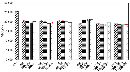 The VMA results for all the recycled CMAs indicate the durability performance of the bituminous mixtures described in Figure 11. For CMA design, the minimum VMA for 19 mm nominal maximum aggregate size (NMAS) is 14% per MoRTH specifications. The VMA of the CMAs with and without RAP content was determined to be 25.374%, 20.299%, and 18.915% for CM, 50R, and 100R, respectively, without any additives. By adding cement, FA, and SR fillers to the CMA mix with RAP, the VMA of the blend was reduced up to 2% in 50R mixes with filler additives due to the increasing unit weight of mixes. But in the case of 100R CRAMs with FA and SR additives, mixes are exposed to less moisture than 50R mixes, so they achieve fewer VMAs.