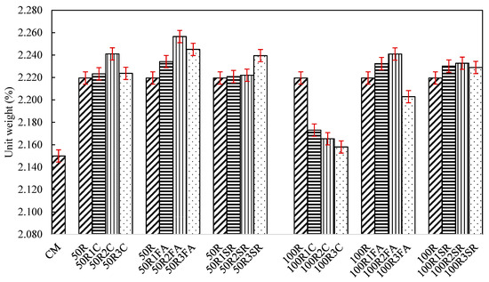 The unit weights of different CMA mixtures increased in the 50% RAP mix compared to the control CM mix, as graphically presented in Figure 12. This is due to the RAP binder covering the RAP aggregate on the outer surface (Figure 2), which has a higher unit weight than the control mix without RAP. Afterward, upon increasing the RAP percentages (100%), the unit weight decreased upon incorporating cement additives (up to 3%) due to the lower specific gravity of RAP aggregates compared to VA, as seen from the results presented in Table 1.