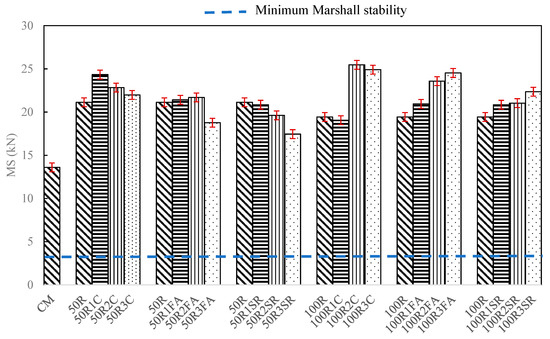 The MS increased with RAP content (in 50% and 100%) with and without a filler compared to the CMA mix without the addition of RAP. The maximum MS was achieved with 1% cement (50R1C) due to the cementing action with VA, RAP aggregating, and the binder in the CMA mix. Also, the MS with 2% FA and 2% SR filler equaled the maximum MS.