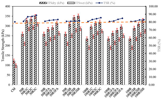 Afterward, the tensile strength ratio (TSR) of recycled cold mixtures was evaluated based on the ratio of wet ITS to dry ITS in percentages. It was analyzed to determine the moisture susceptibility of CMA mixtures, which depends on aggregate types. TSR is the result of the separation and removal of binder from the aggregate surface in the presence of moisture, and the TSR was analyzed as follows: