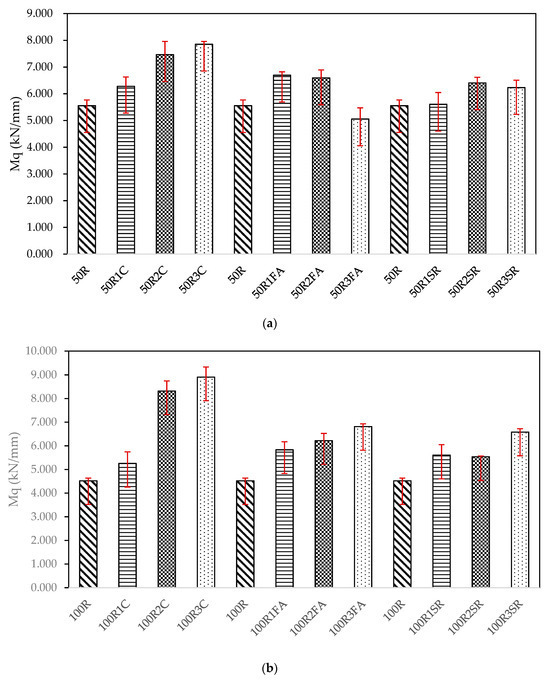 The inclusion of additives to the mixes resulted in a higher Mq than those without additives and RAP mixes. The Mq of CMAs with 50% RAP and 100% RAP inclusion is presented in Figure 15a,b. Only the 50R3FA and 100R1C mixtures exhibited a lower Mq value. It was observed from the results that the Mq value increased with the incorporation of additives (cement, FA, and SR at 1%, 2%, and 3% of dry aggregate weight) with 50% and 100% RAP aggregate. The maximum Mq was obtained at 3% cement additives with the 100% RAP mix, which indicates that the cement is highly reactive with the binder compared to the other additives. When the MS increases with increasing filler percentages and the flow value decreases, Mq rises.