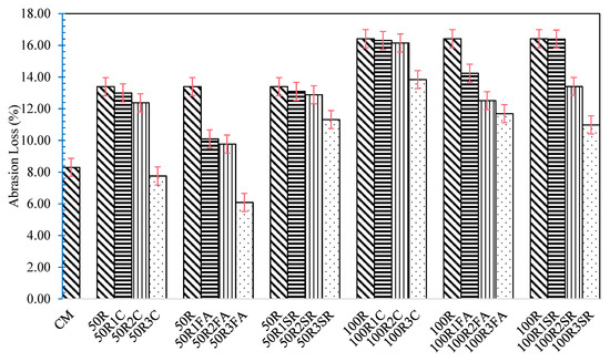 A low abrasion loss value is always required for pavement susceptible to raveling failure. It was observed that the utilized additives reduced the abrasion loss of mixtures. It can be analyzed from Figure 16 that the abrasion loss was enhanced due to incorporating recycled materials in place of VA. Still, it was reduced by using the additives with and without recycled materials. The abrasion loss is reduced with an increase I additives up to 3% of 50R (50R3FA < 50R3C < 50R3SR) (Figure 16). It signifies that the RAP and CSS2 binder adhere better in 50R cold recycled mixtures than in the control and 100% RAP mixes. Incorporating additives would not adversely affect the abrasion resistance of the CMA-RAP mixtures. In the case of CMA with 100% RAP, abrasion loss increased compared to 50% RAP. The minimum abrasion loss for CMA mixes with 50% RAP aggregate was attained by 50R3FA, and the maximum abrasion loss was achieved by 100R due to the presence of agglomerates. More agglomerates were present in the 100% RAP mixtures, and they broke down after applying external forces [28], which proves there was more abrasion loss in the 100R mixes compared to CM and 50R mixes. Abrasion loss is reduced after adding additives into the 100R mixes because fine particles fill the interstices between mixes.