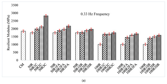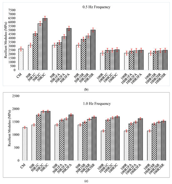 Resilient modulus of CMA with 50% and 100% RAP at different percentages of fillers and frequency at 25 °C. (a) 0.33 Hz; (b) 0.50 Hz; (c) 1.00 Hz.