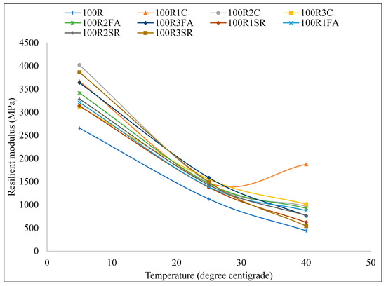 The results of resilient modulus depend upon the structural behavior of the mix because it is related to the capacity of the material, which is used to generate the data for pavement design or pavement evaluation and analysis. The MR was evaluated at different pulse repetition periods, 3000 ms, 2000 ms, and 1000 ms, as shown in Figure 17a, b and c, respectively. The number of conditioning pulses was kept constant (1000). The resilient modulus of the CMA mixes was evaluated at different frequencies (0.33 Hz, 0.5 Hz, and 1.0 Hz), and frequency is the ratio of the conditioning pulse to the pulse repetition period. The resilient modulus value increased with additive percentages of up to three percent, and the maximum resilient modulus was achieved by the 50R3C mix, surpassing all cold recycled mixtures. The maximum resilient modulus was attained upon the inclusion of 3% cement additive with the 50R mixes due to the role of water in the hydration of cement and pozzolanic reaction [54]. A higher resilient modulus value indicates better mixture stiffness. In this research, 50R cold recycled mixtures are stiffer than the control mix, and 100R mixtures are at different frequencies. The results show that the resilient modulus of the CM, 50R, and 100R mixes are 2641 MPa, 3000–6000 MPa, and 2000–3000 MPa, respectively, which indicates the bonding between the aggregate and binder of the 50R mixes is better than that of other mixes. Cement is an effective additive compared to FA and SR. It can be seen that the resilient modulus of 100R mixtures reduces as the temperature increases (Figure 18). Based on data analysis at all temperatures tested (5 °C, 25 °C, and 40 °C), an increasing trend in MR values was observed up to 50% RAP, while the further addition of RAP (100% RAP) reversed the trend.