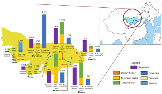 Basic information of the seven prefectures connected by the Yellow River in Inner Mongolia. The population, GDP, and water usage of each sector in 2017 is shown.