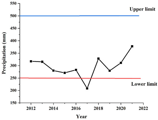Annual precipitation in Inner Mongolia from 2012 to 2021. Semi-arid climate is defined as having an annual precipitation of 250–500 mm; the lower and upper limits are depicted in the figure [42,43,44].