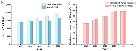 The results were validated using observational data from 2017 to 2021. From an eco-nomic perspective (Figure 4a), our simulated GDP was higher than the actual value because of price variation. The GDP before the COVID-19 pandemic and amount of water resources for all labeled years (Figure 4b) were projected with relative accuracy. The COVID-19 pandemic in 2020 likely caused production to all but cease, reducing GDP production and increasing water availability. In 2021, industries began to reopen on a larger scale, leading to an increasing pattern in the GDP and water resources. Along with COVID-19, previous literature discussed two other reasons that caused the decline in the GDP growth rate: (1) the downward growth rate of investments from 2015–2020 and (2) government policy restrictions on overheated industries [40,76,77]. In addition to unexpected incidents, the correlation between the model and reality indicated the existence of an empirical relationship, which allows future simulations to analyze the relationship between water resources and economic output.
