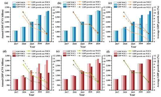Figure 5d–f show the effects of climate change under a fixed water-saving intensity. An increasingly humid climate results in a rise in regional GDP. Figure 5d shows that under current water-saving intensities, the 2035 GDP of scenario W0C1 increases by 18% and 72% compared with those in scenarios W0C0 and W0C2, respectively. However, this increase was reduced to 4% and 15%, respectively, when a moderate water-saving approach was adopted (Figure 5e). This indicates that a moderate approach can be considered sufficient to sustain GDP development under present climate conditions, but it is still inadequate in arid conditions. As shown in Figure 5f, when water-saving conditions are intensified, the discrepancy is further reduced (to 0.4% and 1%). The GDP growth rates in the three scenarios display a maximum difference of 0.2%, confirming that intense water-saving policies can counteract the negative effects of arid climate.