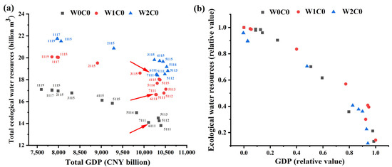 Pareto frontier under different water-saving intensities. Total GDP and total water resources were calculated by summing the GDP and water resources of 2017, 2020, 2025, 2030, and 2035. (a) Absolute value; the weight of the four objectives is labeled at each point; for example. “1119” implies that the ratio of the weights of the economic, social, environmental and ecological objectives are 1:1:1:9. The red arrows indicate the area where the corresponding ratio between the economic and ecological objectives causes the Pareto frontier to reverse in direction. (b) Relative value, calculated through normalization to render the slope of the frontier more discernable.