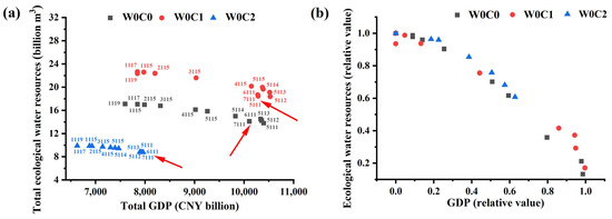 Climate change demonstrated patterns similar to those of the water-saving intensity, (Figure 7a). Under the same GDP, a more humid climate is considered a Pareto improvement. The frontier of scenario W0C2 shifted down and to the left, indicating that an arid climate with no water-saving strategies was Pareto-worsened in both economic and ecological terms. The Pareto frontiers in Figure 7a are almost parallel to each other, as indicated by the consistent relative value of the Pareto frontiers in Figure 7b. Compared with the Pareto frontiers in Figure 6, the GDP in Figure 7 is inversely related to ecological water resources until the ratio of the objectives reaches its turning point of 6:1 (red arrows in Figure 7a).
