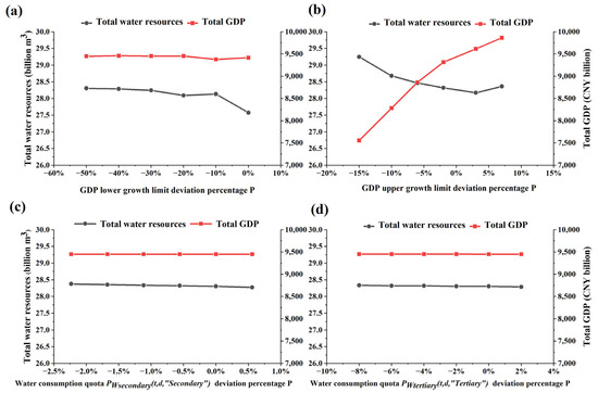 Total GDP and total water resources when adjusting different paraments: (a) GDP lower growth limit , (b) GDP upper growth limit , (c) water consumption quota for the secondary sector , and (d) water consumption quota for the tertiary sector . The original parameter used in our model is the value when the deviation percentage is 0%.