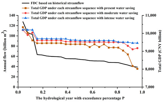 Relationship between total GDP and the FDC under different water-saving conditions. The horizontal axis represents the specific hydrologic years arrayed by the exceedance percentage, and each hydrologic year corresponds to a specific total GDP output.