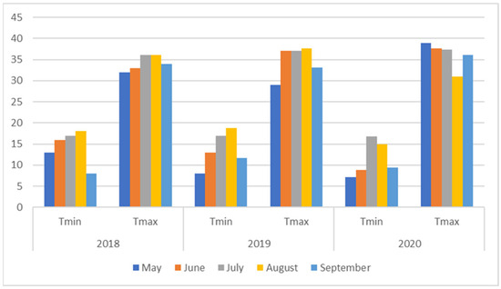 The climate in the experimental area is characterized as the typical Mediterranean with warm dry summer and cool humid winter. In 2018, the GDDs of the cotton growing period were greater (2270.5) than those in 2019 (2128.5) and 2020 (1956.2). The rainfall from May to September in 2018 was also higher (189.9 mm) than that recorded during the same period in 2019 (97.5 mm) or 2020 (134.2 mm) (Figure 1). Also, according to Figure 2, May 2018 had the highest minimum temperature in comparison to the other growing years, while in September 2018 the lowest minimum temperature was observed.