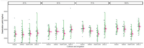 Effect of cultivar and irrigation on seed cotton yield(kg/ha). The points are the raw data, the green is the boxplot of the dataset, the pink dot is the average yield, and the pink error bars represent (estimated marginal) means ± 95% confidence interval per group. Means followed by the same letter do not differ statistically according to post hoc Bonferroni test at 5% probability.