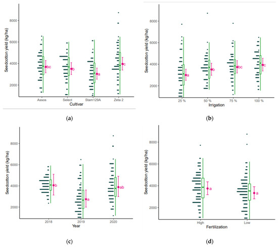 Seed cotton yield (kg/ha) as affected by (a) cultivar, (b) irrigation, (c) year, and (d) fertilization. The points are the raw data, the green is the boxplot of the dataset, the pink dot is the average yield, and the pink error bars represent (estimated marginal) means ± 95% confidence interval per group. Means followed by the same letter do not differ statistically according to post hoc Bonferroni test at 5% probability.
