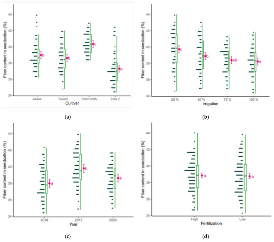 Fiber content (%) as affected by (a) cultivar, (b) irrigation, (c) year, and (d) fertilization. The points are the raw data, the green is the boxplot of the dataset, the pink dot is the average yield, and the pink error bars represent (estimated marginal) means ± 95% confidence interval per group. Means followed by the same letter do not differ statistically according to post hoc Bonferroni test at 5% probability.
