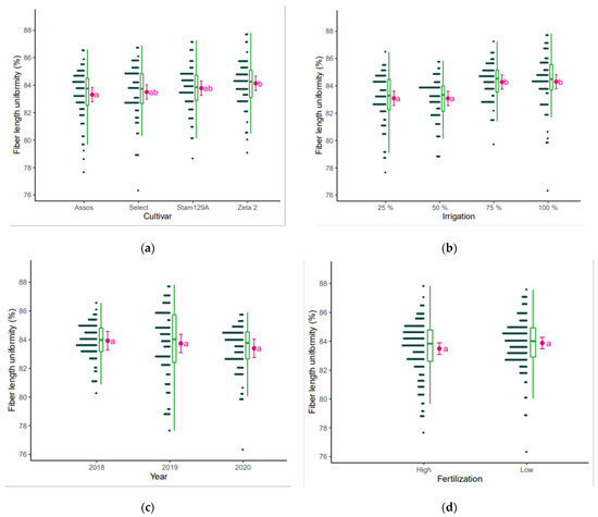 Fiber length uniformity (%) as affected by (a) cultivar, (b) irrigation, (c) year, and (d) fertilization. The points are the raw data, the green is the boxplot of the dataset, the pink dot is the average yield, and the pink error bars represent (estimated marginal) means ± 95% confidence interval per group. Means followed by the same letter do not differ statistically according to post hoc Bonferroni test at 5% probability.