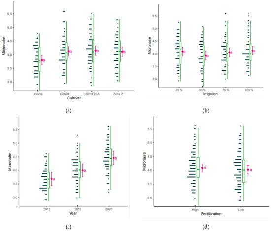 Micronaire as affected by (a) cultivar, (b) irrigation, (c) year, and (d) fertilization. The points are the raw data, the green is the boxplot of the dataset, the pink dot is the average yield, and the pink error bars represent (estimated marginal) means ± 95% confidence interval per group. Means followed by the same letter do not differ statistically according to post hoc Bonferroni test at 5% probability.