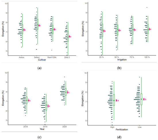 Elongation (%) as affected by (a) cultivar, (b) irrigation, (c) year, and (d) fertilization. The points are the raw data, the green is the boxplot of the dataset, the pink dot is the average yield, and the pink error bars represent (estimated marginal) means ± 95% confidence interval per group. Means followed by the same letter do not differ statistically according to post hoc Bonferroni test at 5% probability.