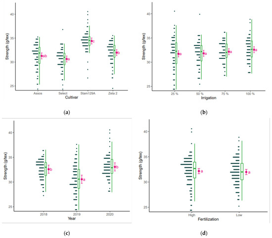Strength (g/tex) as affected by (a) cultivar, (b) irrigation, (c) year, and (d) fertilization. The points are the raw data, the green is the boxplot of the dataset, the pink dot is the average yield, and the pink error bars represent (estimated marginal) means ± 95% confidence interval per group. Means followed by the same letter do not differ statistically according to post hoc Bonferroni test at 5% probability.