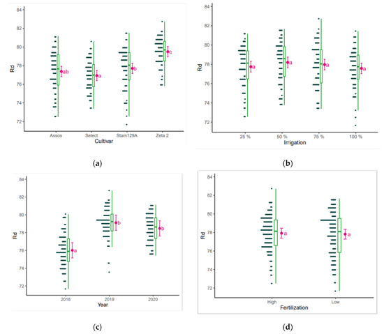 Reflectance (Rd) as affected by (a) cultivar, (b) irrigation, (c) year, and (d) fertilization. The points are the raw data, the green is the boxplot of the dataset, the pink dot is the average yield, and the pink error bars represent (estimated marginal) means ± 95% confidence interval per group. Means followed by the same letter do not differ statistically according to post hoc Bonferroni test at 5% probability.