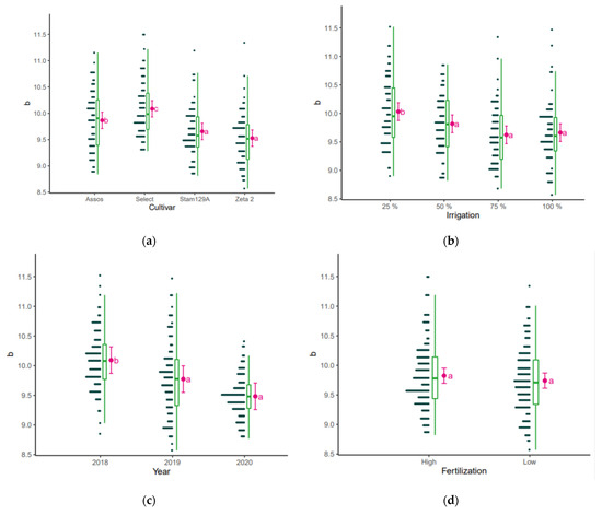Value “b” as affected by (a) cultivar, (b) irrigation, (c) year, and (d) fertilization. The points are the raw data, the green is the boxplot of the dataset, the pink dot is the average yield, and the pink error bars represent (estimated marginal) means ± 95% confidence interval per group. Means followed by the same letter do not differ statistically according to post hoc Bonferroni test at 5% probability.