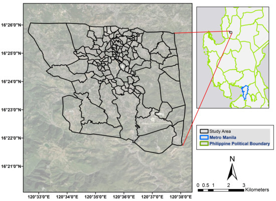 Baguio City, often known as “Baguio,” is an attractive mountain city nestled in the Cordillera mountain range on the island of Luzon (Figure 1). It is located approximately 270 km north of Manila, the capital of the Philippines, at an elevation that varies between 900 and 1600 m above sea level [25]. Classified as a highly urbanized city within the CAR (Cordillera Administrative Region), Baguio consists of 129 smaller administrative divisions known as barangays—analogous to districts in other cities—and covers a land area spanning 57 square kilometers. According to the Philippine Census of Population and Households 2020 [26], it has an urban population of 366,358.