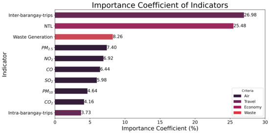 The Importance Coefficient values of the ten indicators in this study are ranked and shown in order from highest to lowest importance in Figure 2. Indicators of travel, specifically inter-barangay trips (IC = 26.98), economy (IC = 25.48) and waste (IC = 8.26) rank above all other indicators for air, which is further ranked in order of (IC = 7.40), (IC = 6.92), CO (IC = 6.44), (IC = 5.98), (IC = 4.64) and (IC = 4.16). The intra-barangay trips show the lowest importance with IC = 3.73.