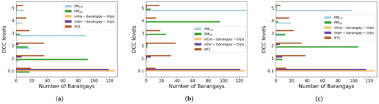 The data obtained for each indicator per temporal context and barangay were classified into DCC levels following Table A1, Table A2 and Table A3. Histograms of the levels of the DCC indicator per temporal context are generated and distinguished by the granularity of the indicator, whether city-level or barangay-level. Based on the calculated DCC of indicators for each temporal context (see Table A1, Table A2 and Table A3), among the indicators that have no previously applied classifications, only three out of seven indicators (, , and NTL) have largely varying DCC levels for the temporal context. Due to the lack of ground truth and modeling studies on the actual DCC levels of NTL and , the succeeding analyses and calculations of load numbers (LN) are based on the DCC levels per temporal context.