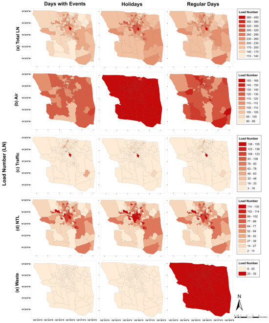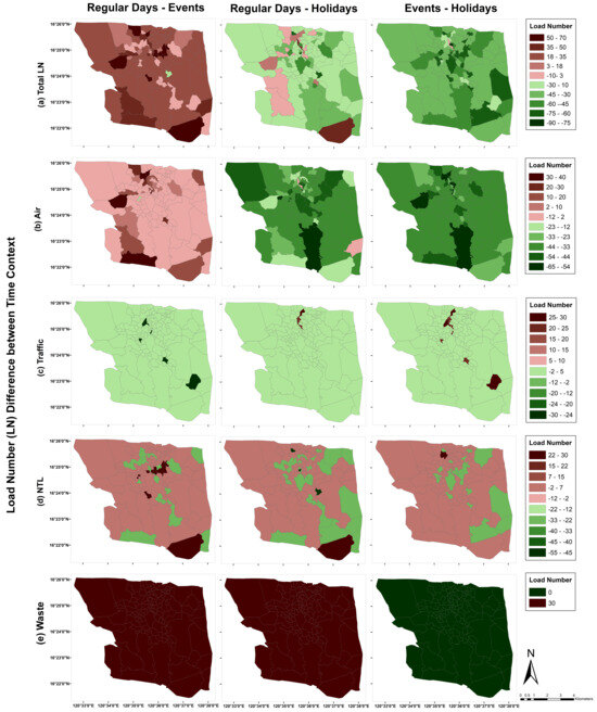 Although the results from the number of trips may not capture the complete effect of events on holidays in most parts of the city, the use of NTL may be more informative in terms of measuring the change in load number of human-induced impacts on non-regular days from regular days (Figure 6d) since NTL has been shown to capture information regarding economic activities and human movements [21]. Finally, the differences in waste generation in Figure 6e may provide insight into the improvements needed in the city. The high difference in waste generation between regular days and non-regular days may be indicative of the suspension of waste collection as workers may also be having their breaks on holidays or may not be able to collect waste on days with events because of a lack of access to collection sites due to several roads being closed and blocked during events.