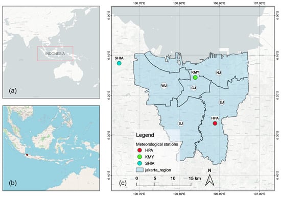 Study area (a) map of Asia; (b) map of Indonesia; (c) map of Jakarta and meteorological stations location.