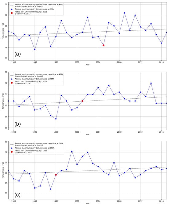 The annual maximum daily temperature change trend and the changing point at the meteorological stations. (a) The HPA station; (b) the KMY station; (c) the SHIA station.