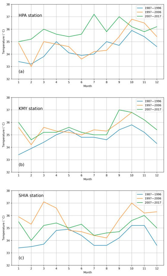 Maximum daily temperature between 1987 and 2017 in Jakarta. (a) Monthly maximum daily temperature at the KMY station; (b) monthly maximum daily temperature at the HPA station; (c) monthly maximum daily temperature at the SHIA station.