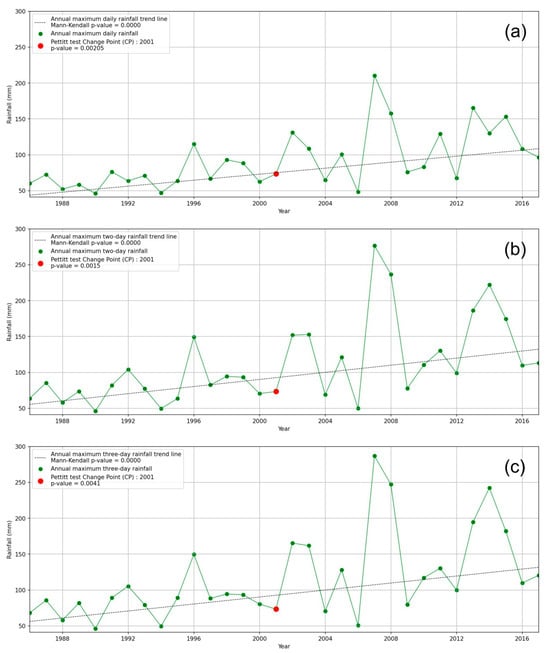 The statistical test results from the Mann–Kendall test showed that there was an increase in daily rainfall and daily accumulated rainfall in Jakarta between 1987 and 2017, as depicted in Figure 6, with a significant p-value of <0.05. The increasing trend of accumulated daily rainfall was observed for daily rainfall (Figure 6a), two-day rainfall (Figure 6b), and three-day rainfall (Figure 6c). Furthermore, the accumulated daily rainfall started increasing in 2001, as indicated by the changing point of the Pettitt’s test with a significant p-value of <0.05.